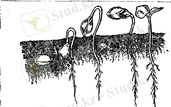 Өсіп-даму кезеңдері. 1. Тұқымның өнуі мен егін көгінің пайда болуы. Қарақұмық тұқымының өнуі ұрықтық тамыршаның түзілуімен басталады да, ұзара өсіп топыраққа бойлай сіңіріледі. Бір мезгілде тұқым жарнағының қалтасы (подсемедольное колено) ұзарады, оның пішіні доға тәріздес және өзінің төбесімен топырақ бетіне шығады, ал соңынан тұқым жарнақтары (7-8 тәуліктен соң) шығады. Осы кезеңді көктеу немесе егін көгі деп атайды (Сурет 14) .