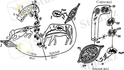 Қоздырғыштарының дамуы (111-сурет) . Саркоспоридилердің дамуы 3 сатыдан тұрады; мерогония, гаметогония және спорогония.