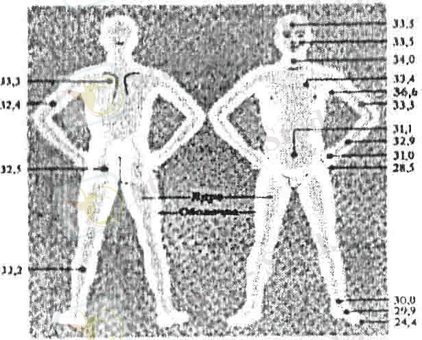 Адам денесінің температуралық картасы дегеніміз, организмнің түрлі органдарды зат алмасу деңгейіне байланысты. Осы себептен дененің сырт бөлімінің температуралары әртүрлі болады. Тері температурасы 24, 4 С - 34° С арасында. Терінін ең төменгі температурасы аяқтың саусақтарында анықталса, ең жоғары температура колтықта анықталады. Ен төмеагі температурасы аяқтың саусақтарында 24, 4 С, табан температурасы 29, 9° С, тобықта -30, 0° С, балтырда -32, 2° С, жамбаста-32, 5 0 С, кіндікте-31, 1 0 С, жүрек тұсында-33, 4 0 С, мойында-34, 0 0 С, бетге-33, 5 0 С, маңдайда-33, 5 0 С, қол саусақтарында-28, 5 0 С, алақанда-31, 0° С, білекте-32, 9° С, шынтақта-33, 3 0 С, қолтықта-36, 6 0 С, колдың сыртқы бөлімінде-32, 4° С, жауырында-33, 3 0 С.
