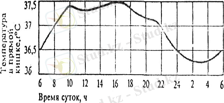 5. Дене температурасының тәуліктік немесе циркадты ауытқулары. Көптеген адамдардың қолтық температурасы - 36, 6° С-, 37° С шамасында болады. Тік ішек - ректальді температурасы, аксиллярлы немесе қолтық асты температурасынан-0, 5-0, 8 0 С жоғары келеді. Адам және кейбір жануарлардың температуралары біркелкі қозғалыс пен коректену жағдайларына қарамастан тәулік бойына ауытқып тұрады.