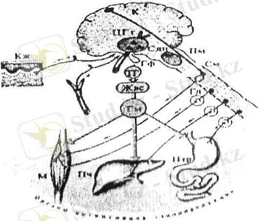 Теріде орналасқан терморецоптор мен қан тамырда орналасқан рецепторлардан ақпарат термореттеу орталығына барады. Бұл жерде келген ақпарат сарапталып, эфферентік жол арқылы сопақша ми мен жұлын арқылы өтіп вегетативтік жүйкелердің көмегімен жылу өндіретін мүшелерін имиульс келеді, яғни бұлшық еттерге, бауырға, асқорыту жолдарына, жылу өндіру күшейеді. Бұл нервтік жол, Ендігі реттеуші жол - гуморальдық, Гипоталамо - гипофизарлық жол арқылы ақпарат гипофиздің тиреотропты гормонының синтезделіп, қалқанша бездің гормондарының көмегімен зат алмасу процссі қарқындайды, яғни қаңқа бұлшық еттеріне, бауырға, асқорыту жолдарындағы процестерге әсерін тигізеді.