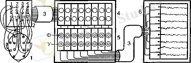 1 -электрдтары көрсетілген зерттелушінің басы ( төбесінен көрсетілген) ; 2 - кіріс қорап; 3 - жалғағыш кабельдер; 4 - әр канал үшін айырып -қосқышы бар селекторлық блок ; 5 - Қатаң немесе икемді күшейтуді реттейтін (У), реттегіштері бар, жоғары және төменгі жиіліктегі фильтрлермен ( Ф) берілген күшейту блогы (У) ; 6 - тіркеу блогы.