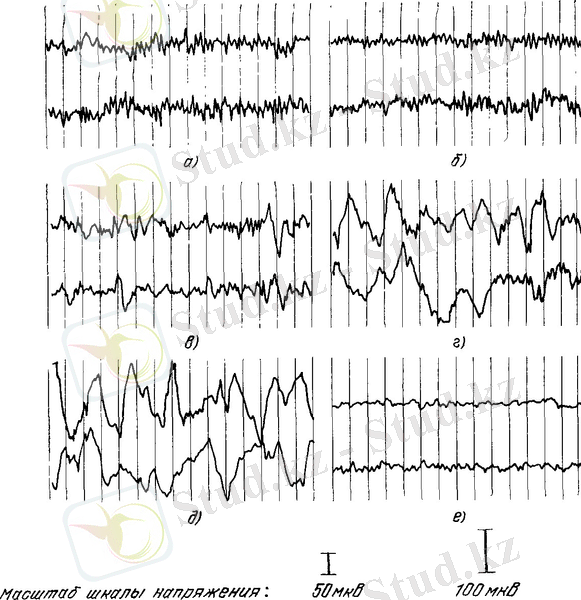 10сурет. ЭЭГ -нің ұйқының әр түрлі кезеңдеріндегі типті мысалдары. Әр мысал үшін жоғары жазу мидың сол жақ алдыңғы бөлігінен жасалған., төменгі жазу - желкенің оң жағынан : а - пациент өзін сергек сезінеді., ЭЭГ-де әр түрлі жиіліктер кездеседі; б - 1 кезең пациент қалғиды, в ЭЭГ-де альфа-толқындар ең көп үлес қосады. ; в - 2 кезең жеңіл ұйқы, ретті емес баяу толқындар пайда болады ; г - 3 кезең ұйқы, баяу толқындар көрініп тұр; д -4 кезең ЭЭГ- де баяу толқынды терең ұйқы; е - парадоксальдық ұйқы немесе ұйқы.