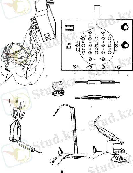 Бас миының электрлік белсенділігін тіркеуге арналған құралдар электроэнцефалограф деп аталады. Энцефалографта 8-16 және одан да көп күшейткіш - тіркегіш блоктар (каналдар) бар. Олар бір мезгілде электродтардың сәйкес жұптарынан биоэлектрлік потенциалдарды тіркеуге мүмкіндік береді. Энцефалография электродтары зерттелушінің басына резиналық жіптердің немесе арнайы шапочкалардың, жабыстырылатын ленталардың т. б көмегімен бекітіледі. Бекіту бастың орталық сагитталдық сызығымен салыстырғанда симметриялық түрде жалпы қабылданған - « Электродтарды орналастырудың 10-20 жүйесі » бекітпелер схемасы бойынша жүргізіледі. Бұл жүйе қоғамның Халықаралық федерациясы комитетінің жасауымен қабылданған. Жүйенің аталуы бастың белгілі нүктелерінің арақашықтығы 10 және 20% құрайтындай етіп электродтардың орналастыру интервалына негізделген (6. сурет) . Электродтардың ара қашықтығын анықтау пайызбен қабылданған .