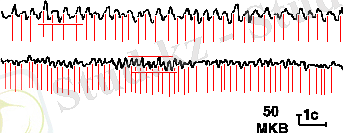 ( биіктігі бойынша) және олардың арасын мм -мен, жоғары сызықтар үшін 10 мм, төменгі сызықтар үшін 6 мм -шамасымен өлшейміз. Оң жақ бұрышта ∟ белгісінің суреті тұр, оның биіктігі (5 мм) микровольтты (мкВ) көрсетеді, ал ұзақтығы (11 мм) секундтарды (с), олар 50 мкВ және 1с сәйкес бірліктермен алынған. Жоғары жақтағы қисықтың амплитудасын есептейміз: егер 50 мкВ (калибровка) 5 мм -ді құрайтын болса, 10 мм тербеліс амплитудасы (10мм×50мкВ/5мм=100 мкВ) болады , жоғары жақтағы қисық тербелістері үшін амплитуда 100 мкВ болады. Жиілікті өлшеу үшін жеке тербелістерге өлшеу белгілерін жүргіземіз ( қисық сызық ноль арқылы өтеді деп алынады) және вертикаль сызықтармен белгілейміз. Енді перпендикулярлар арасындағы қашықтықты өлшеу керек. Жиіліктің герцпен өлшенетіні бізге белгілі (Гц бір секундтағы тербелістер саны) . ∟ белгісі бойынша 1с ұзындық суреттің бұрышында 11 мм -ге тең. Егер тербелістер арасындағы қашықтық 4 мм -ге тең болса, оның секундпен алынған ұзақтығы қандай болады? Есептеп шығарамыз: 1сек×4мм/11мм=0 , 36сек, енді берілген тербелістің жиілігін Гц- пен анықтаймыз: 0, 36сек уақытта 1 тербеліс жасалды, 1секундта - х тербеліс болуы керек . Есептейміз: 1сек×1тербеліс/0, 36сек=2, 7тербеліс бір секундта ( Гц) . 2, 7 Гц Δ (дельта) ырғаққа сәйкес келеді. Осылайша біз әр тербелістің жиілігін анықтай аламыз. Талдау үшін индекс қолданылады. Индекс- ЭЭГ жазуының біз зерттеген бөлігіндегі ырғақтың қайта кездесу жиілігі. ЭЭГ-де біз жеке тербелісті талдамаймыз, ырғақты талдаймыз. ЭЭГ - де ырғақ -үш және одан да көп тербеліс .