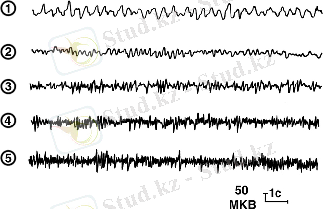 7. сурет әр түрлі физиологиялық ырғақтары: 1-дельта (Δ) -ырғақ 0, 5-3 Гц; 2-тета (θ) - ырғақ 4-7 Гц; 3-альфа (α) - ырғақ 8-13 Гц; 4 және 5 бета ырғақтар 17-70 Гц (4-бета (β) - ырғақ төменгі жиілікті 17-35 Гц; 5-жоғары жиілікті -гамма (γ) -ырғақ 35-70 Гц.