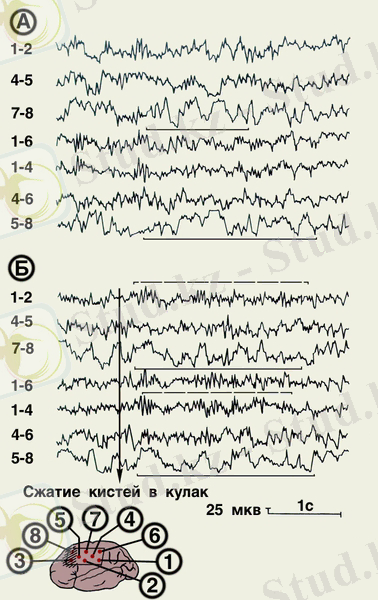 7-8 бекітпелер), патологиялық ошағы бар полиморфтық Δ-толқындар айқындалған ( квадрат жақшалармен көрсетілген ) орталық бөлігінде ( Б. сурет) функциональдық сынама фонындағы электрокортикограмма көрсетілген ( түйілген жұдырық қалпында ) ; бас қабығының перифокальдық аймағында оңашаланған баяу толқындар ( 7-8, 5-8 бекітпелер ) ошақ аймағынан алыста ( квадрат жақшалармен көрсетілген ) α- тербелістердің синхронизациясы жүреді ( 1-2, 1-4 бекітпелер пунктир жақшалармен белгіленген ) .