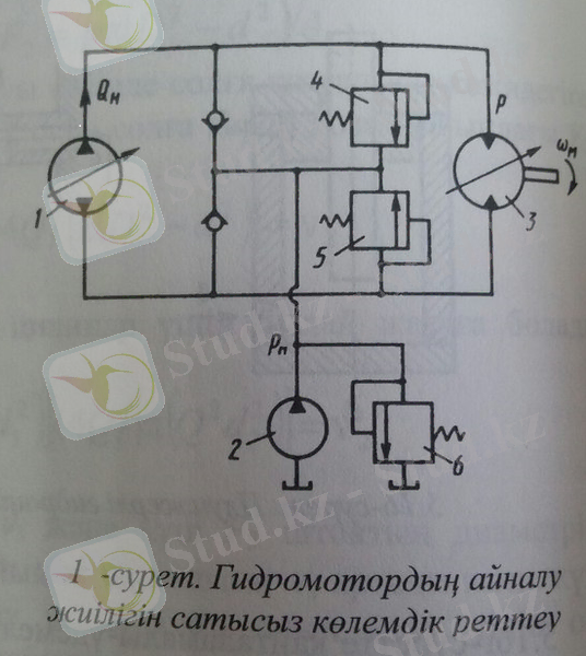Бұлай реттеу тәсілі бір қалыпты (сатысыз) және сатылы жылдамдығын өзгертуін қамтамасыз етеді. Көлемдік сатысыз реттеуге мысал ретінде гидравликалық жетектің айналдырушы қозғалысының тұйықталған циркуляциясын (1 сурет) қарастырамыз. Бұл жетекте екі сорғыны пайдаланады: негізгі 1 беруін реттеуші және қосымша реттілінбейтін 2 және реттелінуші гидромотор 3, ал сонымен қатар үш сақтандырушы және кері қақпақты.
