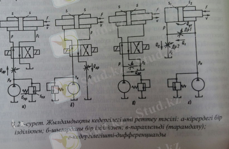 Жетектің гидросүлбедегі кедергілегішінің қондырғыда орналасуына байланысты бірінен соң бірі, параллельді және аралас реттеу (2-сурет) . Бірінен соң бірін реттеу кезінде кедергілегішті гидроқозғалтқышпен бір ізділікпен орнатады. Егер кедергілегішті гидроқозғалтқыш алдына орналасса, онда реттеуді «кірердегі» реттеу деп атайды. (2а-сурет) ; егер гидроқозғалтқыштан кейін орналасса, онда «шығардағы» реттеу деп аталады (2б-сурет) Параллельді реттеу кезінде кедергілегішті гидроқозғалтғышпен параллельді орналастырады. Бұл реттеу тәсілін кейде «тармақталған» деп атайды. (2в-сурет) . Реттеудің аралас тәсілінде қос кедергілегішін қолдануын қарастырғанда, оларды параллелбді және «шығарымен»қабат орналасады . Бұл тәсілін кедергілегішті-дифференциалды деп жиі айтады. (2г-сурет), себебі тек қана гидроцилиндрдің қуыстарының әртүлі тиімді аудандарына S арналған, яғни дифференциалды гидроцилиндріне арналған. Кедергілегішті реттеудің әрбір осы төрт түрлерінің ерекшеліктерін және көрсеткіштерін қарастырамыз.