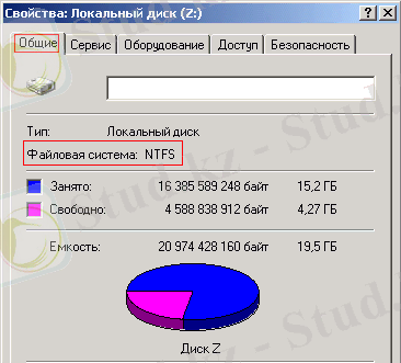 Локальный диск(?:) -ке тышқанның оң жағын басып "Свойства"-ға кіреміз. Содан кейін"Общие" таңдаймыз. Сол терезеден қандай файлдық жүйе қолданылып тұрғанын көреміз.