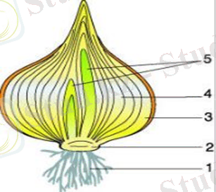 1. Шашақ тамыр. 2. Түбіртек (қысқарған сабағы) . 3. Сыртқы кебу қабыршақтар. 4. Ішкі шырынды жапырақтары. 5. Төбе, қолтық бүршіктері.