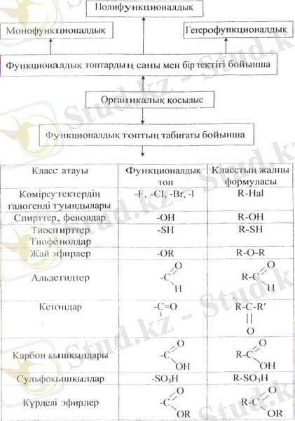 Функционалдық топтардың табиғаты, саны мен біртектілігі бойынша органикалық қосылыстардың жіктелінуі.