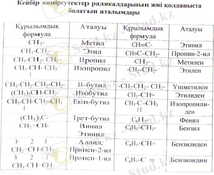 Жиі кездесетін көмірсутектердің құрылымдык формулалары мен аталынулары 3 кестеде берілі ен.
