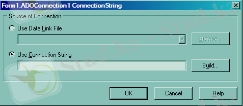 Жаңа жоба құрайық. Енді формаға құрауыштар палитрасынан ADO бетбелгісінен ADOConnection құрауышын кірістірейік. ConnectionString қасиеттінде жазылатын сервермен байланысты баптайық. Ол үшін ConnectionString жолында екі рет шерту қажет және бізге