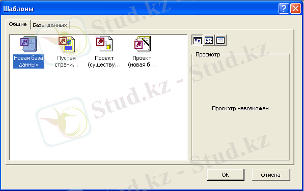 Access-ті іске қосып менюден Файл-Создать командасын орындаймыз. Мәліметтер қорын құру шеберінде «База данных» (Мәліметтер қоры) пунктін таңдап және «ОК» батырмасына шертеміз. (сурет 1. 2. 1) Бізге мәліметтер қорының атын және орны орналасуын таңдау сұралады, қажеттісін көрсетіп, өз файлымызға Database. mdb атауын береміз.