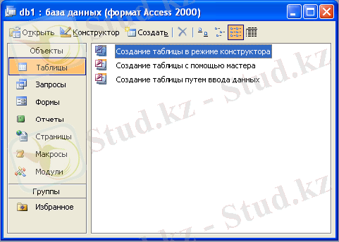 Осыдан кейін Access мәліметтер қорын құрып оны көрсетілген жол бойынша сақтайды. Ал бізге мәліметтер қорымен жұмыс істеу терезесі көрінеді. Терезенің сол жағында жұмыс істеуге арналған объектілерді таңдау бағанасы орналасқан. Ең бірінші «Таблицы» (Кестелер) пункті орналасады (ол үнсіздіктен ерекшеленіп тұрады) . Егер бұл объект бізде ерекшеленбесе онда оны ерекшелеңіз. Терезенің оң жағында үш пункт орналасады: