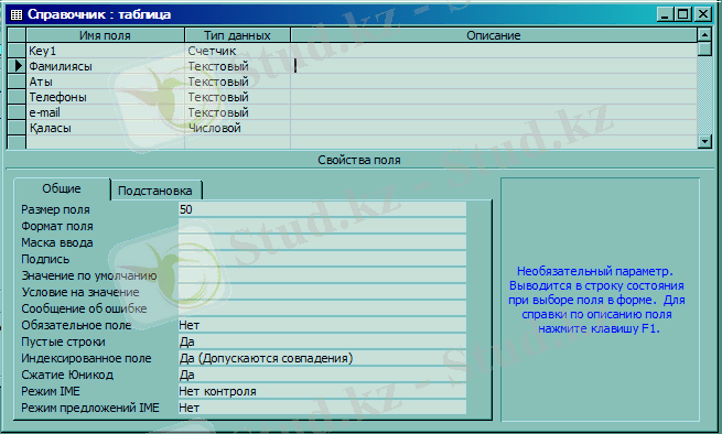 - Өріс атауы -Имя. Типі - мәтіндік (текстовый) . Өріс өлшемі - 50. Индекстелген өріс - «Иә (Да) (Допускаются совпадения) ».