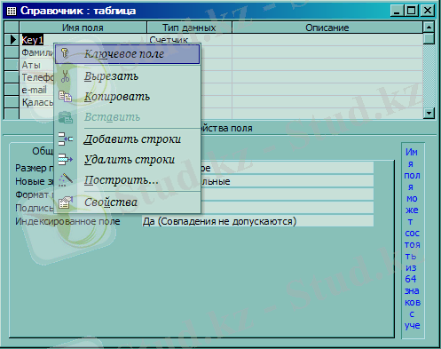 Енді бірінші өрісті ( Key1 ) ерекшелеп тышқанның оң жақ батырмасын басып «Кілттік өріс» (Ключевое поле) пунктін таңдайық (сурет 1. 2. 5) . кілттік өрісті тағайындау міндетті іс әрекет болып есептеледі, егер біз олай етепесек кесте редактіленбейді, ал бұл дегенімізі оған жолдар қосылмайды деген сөз.