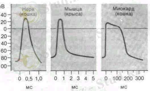 Сурет 1. Түрлі клеткалардағы әрекет потенциалдары. Ордината: клетканың ішіндегі мембраналық потенциалының амплитудасы; абсцисса: әрекет потенциалы басталғаннан кейінгі уақыт (Физиология человека. Ред. Р. Шмидта и Г. Тевса, 1996)