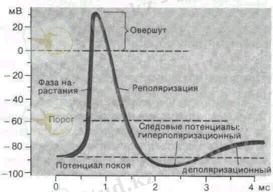 Әрекет потенциалы бірнеше фазалардан тұрады (сурет 2) . Оң бағытталған жедел ауытқу фазасы - ұлғаю фазасы (0, 2-0, 5 мс) .