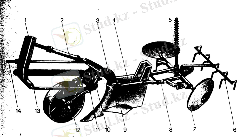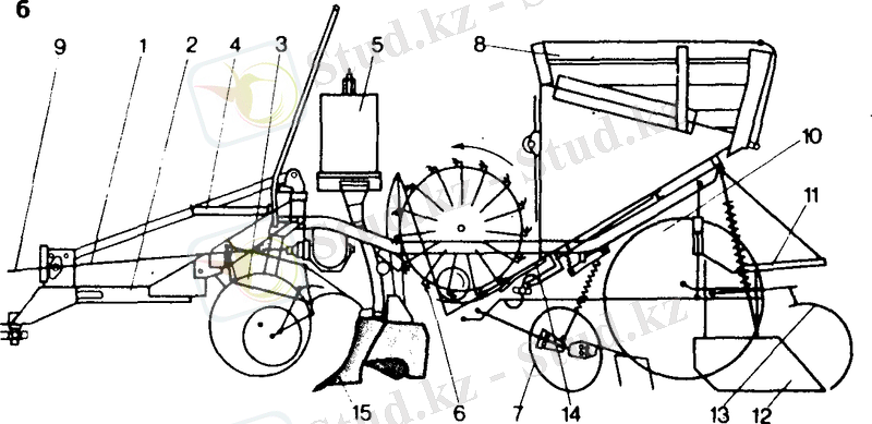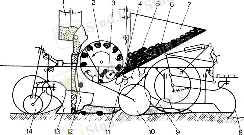 5-сурет. СКМ-6 картоп отырғызғышы: 1- тыңайтқыш сепкіш аппарат, 2- кесіп алу аппараты, 3-шнек, 4-қоректендіру шөміші, 5-араластырғыш, 6- сіліккіш, 7-бункер, 8- қопсытқыш, 9-стабилизатор, 10-борозда жабатын жұмыс органы, 11- жатқыш, 12- түйіндерді қайтарғыш, 13- сошник, 14- тіреуіш доңғалағы.