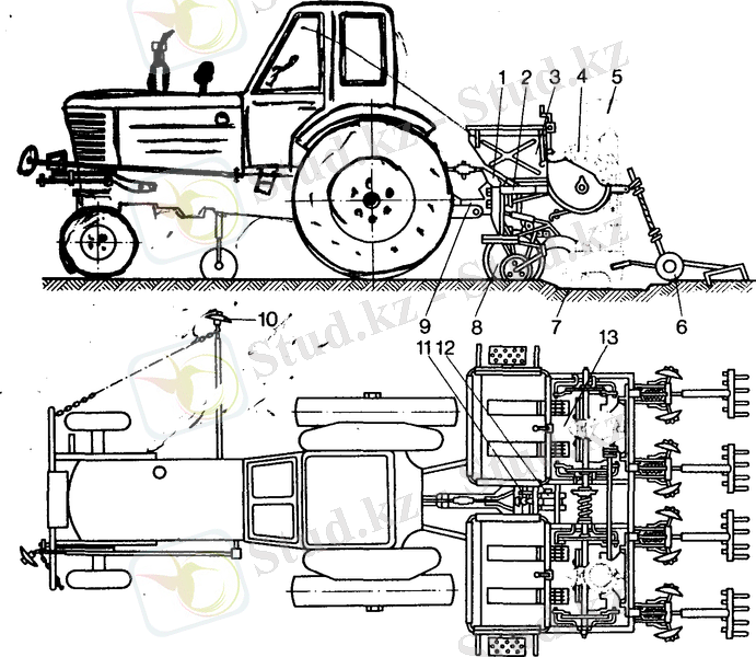 2-сурет Трактормен агрегатталған СН-4Б картоп отырғызғышы: 1-брус, 2-рама, 3- бункер, 4- кесіп алу аппараты, 5-тыңайтқыш сепкіш аппарат, 6-борозда жапқыштың жұмыс органдары, 7-сошниктер, 8- тіреуіш доңғалақтар, 9- жетекші кардандық беріліс, 10-маркерлер, 11-қарсы жетек, 12-редуктор, 13-қоректендіру шөміштері