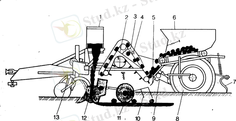 6-сурет. САЯ -4 картоп отырғызғышының технологиялық процесі: 1- тыңайтқыш сепкіш аппарат, 2- тербелме қайықша, 3- серіппелі лақтырғыш тетіктер, 4- отырғызу аппараты, 5- қоректендіру шөміші, 6- бункер, 7- қопсытқыш, 8- жүріс доңғалағы, 9- резеңке фартук, 10- тырма, 11- борозда жабатын дискі, 12- сошник, 13- тіреуіш доңғалақ.