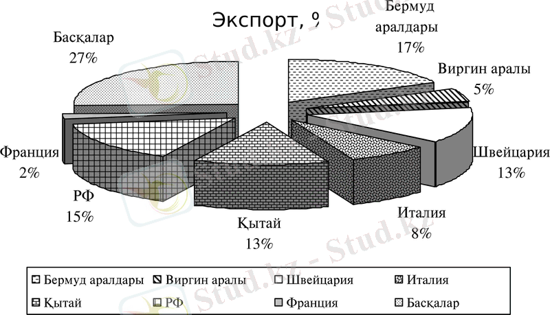 Қазақстан Республикасының серіктес елдермен және тауарлар топтары бойынша экспорттың құрылымын келесі суреттер арқылы анық көре аламыз (1- сурет және 2- сурет)