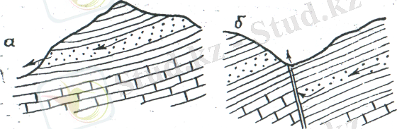 Жер асты сулары өзен аңғарларында, жыраларда бедердің еңіс жағына қарай бағытта жер бетіне бұлақ көздері түрінде шығып жатады (1-сурет) . Осындай жерлерді жер асты суының ағысы (дренаж) деп атайды. Орналасуына қарай жер асты сулары: 1) шөгінді тау жыныстарының (құм, малта тас, т. б. ) кеуек-қуыстарында кездескен жағдайда кеуек-қуыс сулары (2-сурет) ; 2) кристалданған немесе цементтелген тау жыныстарының (гранит, құмтас т. б. ) жарықтары мен жарықшақтарында кездескенде жарықшақ сулары ; 3) оңай