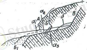 А, Б, В - соқпа толқынның теқіз жағасын бұзып шаюына байланысты кейін тартылған жағалық алқаптың әр турлі жағдайдағы көріністері; a 1 , a 2 . a 3 - кажалған террасалар; Б 1 , В 1 - су астындағы аккумулятивтік террасалардың пайда болу сатылары;