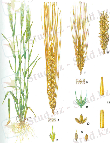 Сурет Арпа. 1, 2-өну және тұқымның толысу кезеңіндегі өсімдік; 3, 4-екі қатарлы арпа және масақтың көлденең кескіні; 5-масақ сағағында орналасқан масақшалар; 6-қауызды және жалаңаш дән; 7, 8, 9, 10-дәл