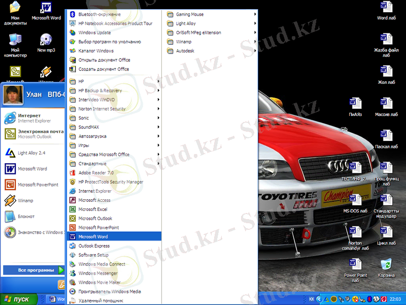 WORD редакторы Іске қосу ( Пуск ) батырмасын басқан кезде пайда болатын «1-суретке қараңыз» Бағдарламалар менюінде көрінетін Стандартты ішкі менюде жұмысқа қосылады. Бағдарламаны жұмысқа қосқан кездеақпаралғы бетінде WORD редакторының терезесі шығады. Терезенің жоғарғы жағында WORD редакторының менюлері көрінеді. Меню мынадай пункттерден тұрады: Файл, Түзету ( правка ), Түрі( вид ), Қою, Формат, Сервис, Кесте( таблица ), Терезе( окно ), Анықтама( справка ) .