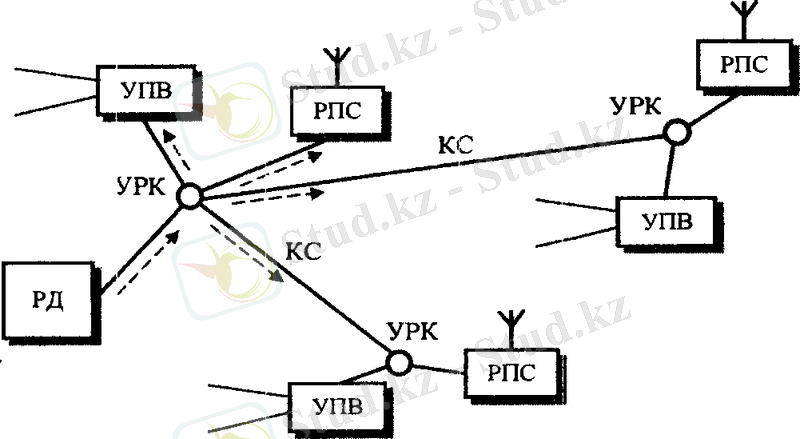 Сурет 1. 6 - Дыбыс тарату желісінің сызбасы: РД - радио үйі (студия) ; РПС - радиотаратушы станция; УПВ - сымды тарату түйіні; УРК - каналдартың бөліну түйіні; КС - байланыс каналы.