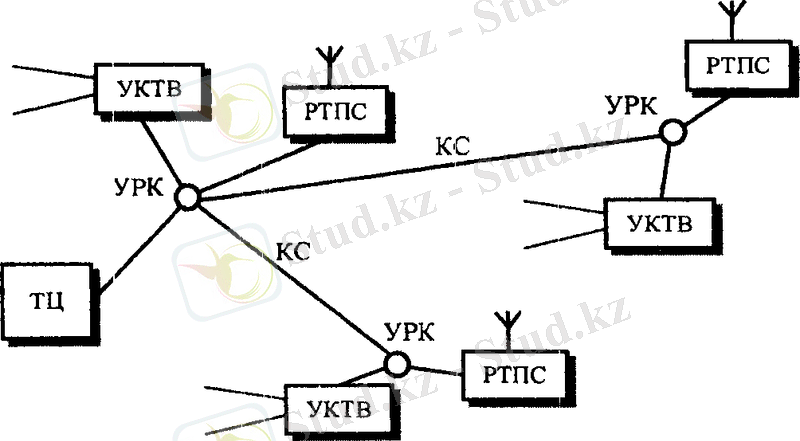 Сурет 1. 7 - Теледидар ақпаратын тарату желісінің сызбасы: ТЦ - теледидар орталығы; РТПС - радиотеледидар ақпаратын тарату станциясы; УРК - каналдардың бөліну түйіні; КС - байланыс каналы.