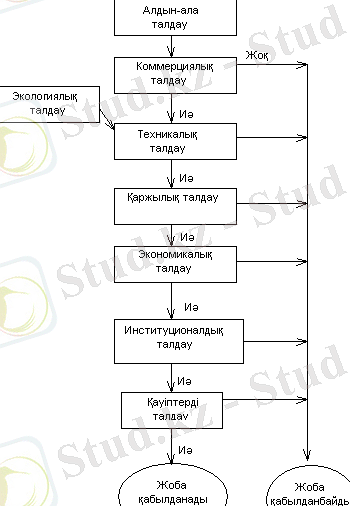 Жобалардың алуан түрлілігіне қарамастан, оларды талдау жобаның коммерциялық, техникалық, қаржылық, экономикалық және институционалдық орындалғыштығын бағалаушы арнайы тараулардан тұратын белгілі бір жалпы сұлбаға сәйкес жүзеге асырылады. Стратегиялық инвестор көзқарасы бойынша дұрыс әзірленген жоба тәуекелдікті талдаумен аяқталуы тиіс. 1. 1-суретте жобаны талдаудың жалпы тізбектілігі көрсетілген. Мынаны ескеру керек, яғни сұлбадағы «Жоба қабылданды» деген резолюция шартты сипатта болады. Жоба шын мәнінде өзінің бастапқы түрінде тоқтатылуы тиіс. Сонымен бірге жоба техникалық тұрғыда орындалмауы себебіне байланысты түрленуі мүмкін және түрленген жобаны талдау қайтадан басынан басталуы тиіс.