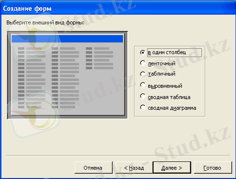 Форма шебері режимінің екінші қадамында формадағы мәліметтердің орналасу түрін таңдаймыз: олар- бір бағана, таспалық, кестелік, тураланған. (3- сурет)