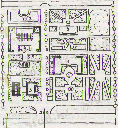 4 - шаруашылық корпусы; 5 - гараж; 6 - сарай; 7 - мәйітхана.