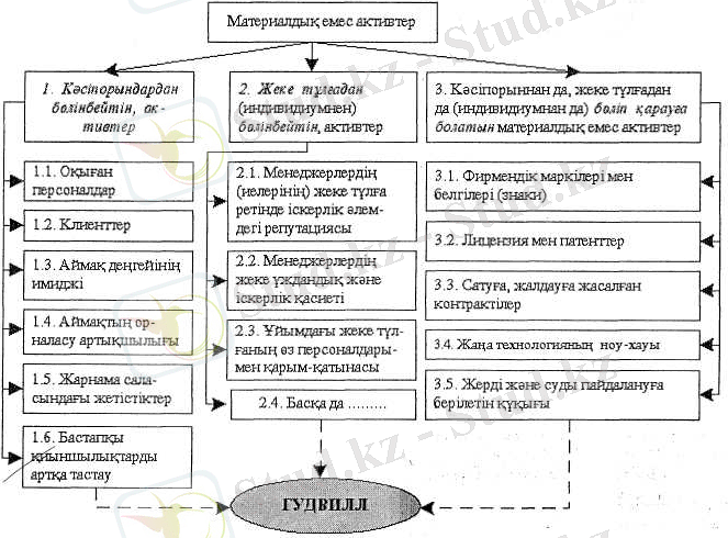 - Қазақстан Республикасының белгілі бір аймағында ғана әрекет етеді; Қазақстан Республикасынан тыс жерлерде де таратылады. Материалдық емес активтердің басқа да түрлері. Материалдық емес активтердің бұл тобына "Фирма бағасы" ("гудвилл"), интеллектуалдық меншік және тағы басқалары кіреді ("гудвилл" құрамына кіретін материалдық емес активтер сызбада көрсетілген) .
