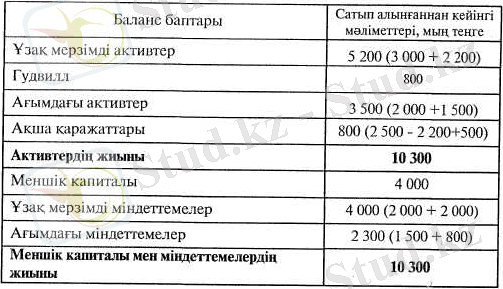 "Виста" компаниясының таза активі 1 400 мың теңге құраған (4 200 мың теңге - 2 800 мың теңге) . "Тұлпар" компаниясы "Виста" компаниясын 2 200 мың теңгеге сатып алып, оның нәтижесінде "гудвиллдің" құны 800 мың теңге құраған (2 200 мың теңге - 1 400 мың теңге) .