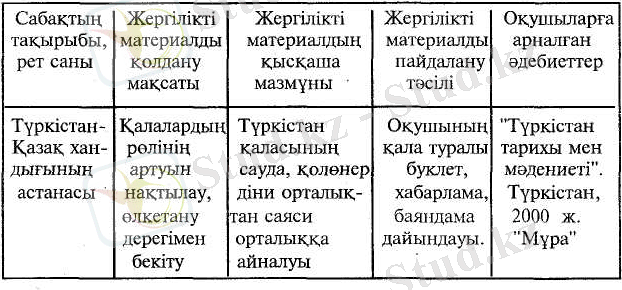 Жинақталған өлкетану материалдарын жүйелі түрде қолдану мақсатын іске асыру үшін мұғалім мынадай жүйеленген таблицаны қолдануына болады.