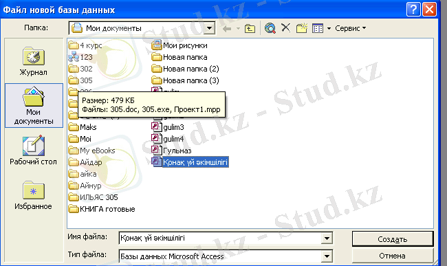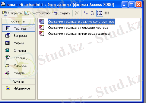 - Егер ондай бұйрық жоқ болса, Файл-Создатьбұйрығын орындасақ, Access-теСозданиетерезесі пайда болады.