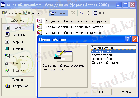 - Кітапхана бөліміатты деректер базасының терезесіненТаблицы-Создатьобъектісін таңдаймыз.