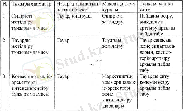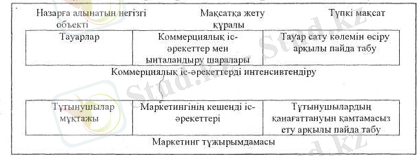 Маркетииг - нарық ауқымындағы кешенді қызмет, сол себепті де оның негізгі мақсатын бірнеше салыстырма нұсқада, ал бағдарламасын кеңінен қарау қажет.