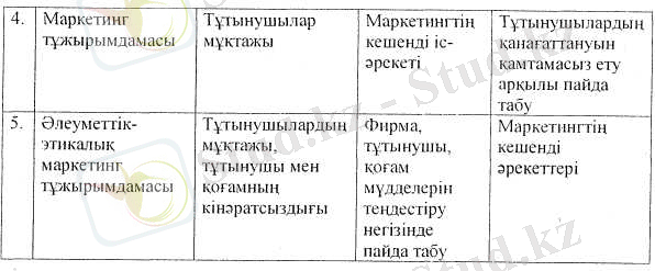 4. Маркетинг тұжырымдамасы. Бұл кәсіпкерлік қызметтегі жаңа көзқарас. Маркетинг тұжырымдамасы фирманың табысты қызметінің басты шарты - тұтыну-шының мұң-мұқтажы мен талап-тілектерін анықтау және оларды ойдағыдай қанағаттандыруды бәсекелесушілерден өзге, тиімді және анағұрлым өнімді тәсілдермен қамтамасыз ету.