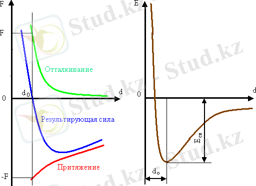 2. 1-cурет. Әсерлесу күшінің өзгерісі (а) және кристалдағы атомдардың жақындау кезіндегі энергиялық байланысы (б)