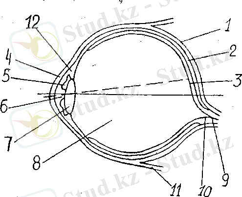 Көз - шар тәрізді мүше (сурет 2) . Ол бас сүйектегі көз шарасына орналасады. Көздің қосалкы мүшелері бар, олар көзді қозғалтып тұратын еттер, май жасаушылары, қабақ, кірпік, қас жас безі. Көз алмасы үш қабаттан тұрады: сыртқы-ақ кабықша (1), ортаңғы-тамырлы (2) және ішкі-торлы (3) қабықша, Ақ қабықшаның алдыңғы бөлігі қасаң қабықша деп аталады. Ол мөлдір қабыкша, жарықты еркін жақсы өткізеді. Тамырлы қабықша көптеген қан тамырларынан. тұрады. Бұл қан тамырлары көздің алмасын қанмен қоректендіріп отырады. Қабықшанын ішкі бетінде жарық сәулесін сіңіріп алатын бояғыш зат қабаты-пигмент бар. Көздің алдыңғы жағында ол калыңдап кірпіктің денесін құрайды. Мұнда кірпіктің бұлшық еті болады. Бұлшық еттің жиырылуы әсерінен көз бұршағының (7) түрі өзгеріп отырады. Кірпік денесі нұрлы қабыкшаға (5) жалғасады. Нұрлы қабықшанын аралығында бояу жасушалары болады. Осы бояу жасушаларынын санынан көздің әр түрлі түсті болып келуіне байланысты. Нұрлы қабықшаның ортасында жарық өтетін тесік орналасады. Оны көздің қарашығы (6) деп атайды. Қарашықты айнала сақиналы бұлшық еттер (12) орналасады. Бұлшық еттер жиырылған кезде қарашық тарылады. Нұрлы қабықтың бұлшық еттері созылғанда қарашықты кеңейтіледі. Қарашық рефлекстік жарық мол жерде тарылып, әлсіз жарық кезде кеңейелді. Көз алмасының ең негізігі қабықшасы торлы қабықша деп аталады. Торлы қабықшада көз рецепторлары таяқшалар мен құтықшалар орналасады. . Адамның көзінде шамамен 130 млн. таяқшалармен 7 млн. құтықшалар болады. Торлы қабықшаның ортасында құтықшалар, ал олардың шет жағына таяқшалар орналасады. Бұл рецепторлардан орта аралық нейрондар жалғасқан жүйке талшықтарынан көз жүйкесі (9) пайда болады. Кез жүйкесінің көзден шығатын. жерінде рецепторлар болмайды, сондықтан ол сезімталдық қасиетінен айырылады. Бұл жерді соқыр дақ деп атайды. Торлы қабыкшаның соқыр-дағынан сыртқа қарай құтықша ғана топтасып жинақталған. Торлы қабықшаның артқы бөлігі - көз алмасының түбі. Көздің ішкі бөлігін күлкілдеген зат- шыны тәрізді дене (8) толтырып тұрады.