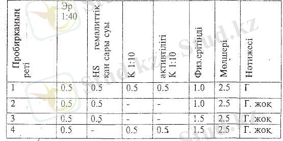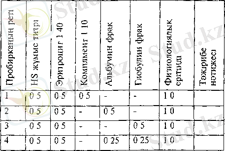 Комплементтің қасиетін, функциясын зерттеу үшін тәжірибе жұмысы төменгі кесте бойынша жүргізіледі.