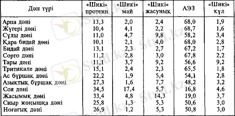 Мал азығына жұмсалатын арпа, жүгері, бидай, сұлы, қара бидай, тары, сорго, т. б. астық тұқымдастар дәнінің құрамында, орташалап алғанда, 9-13% протеин, 1, 5-2% май (сұлы дәнінде - 5%, жүгері дәнінде - 6-8%), 2-3% жасунық (сұлы дәнінде - 9%), 65% крахмал, 2-3% күл болады. Крахмал түріндегі көмірсулары олардың энергетикалық қуаттылығын қамтамасыз етеді. Азықтық бұршақ тұқымдастар дәнінің құрамында 23-33% протеин, 4, 5-7% жасунық, 3% күл, кейбіреулерінде (айталық, соя дәнінде) біршама май болады. Ауыспайтын аминқышқылдарына қаныққан протеині олардың протеиндік құнарлылығын қамтамасыз етеді. Мал азығына жұмсалатын дәннің химиялық құрамы 1-кестеде келтірілген.