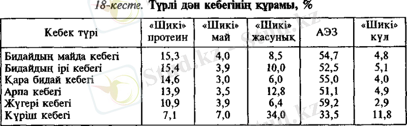 Кебек. Дәнді ұнтақтақтап, елегенде шығарылатын дән қабығы. Елек көзіне сәйкес ірі немесе майда кебек шығарылады. Оның протеинінің аминқышқылдық құрамы өндірілген дәнінікіне сәйкес болады, ал витаминдік құнарлылығы, әсіресе негізінен дән қабығында жиналатын В тобының витаминдері бойынша, дәндікінен асып түседі. Мал азығына жұмсалатын негізгі дәндер кебегінің химиялық құрамы 2-кестеде келтірілген.