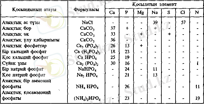 Сүйек күлі - сүйек қалдықтарын жағып шығарады. Құрамында 35% кальций, 16%. фосфор болады. - Азықтық біраммоний фосфат - құрамында 26%-фосгфор, 12% азоты бар ақ, суда еритін кристалды :ұнтақ.